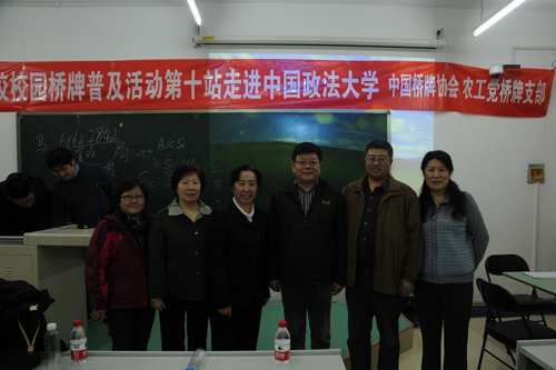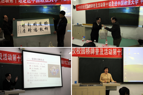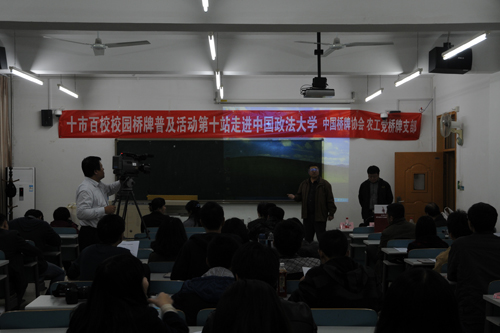 10月29日18:30,由中国桥牌协会、农工党桥牌支部主办,中国政法大学工会和中国政法大学桥牌协会承办的“十市百校校园桥牌普及活动”第十站在昌平校区端升楼207圆满完成。出席此次活动的嘉宾有体育总局棋牌运动管理中心副主任、中国桥牌协会副主席陈泽兰,桥牌国家队队员、世界冠军古玲,以及桥牌大师仲江,中国政法大学桥牌协会会长常林,校工会副主席李玺文。