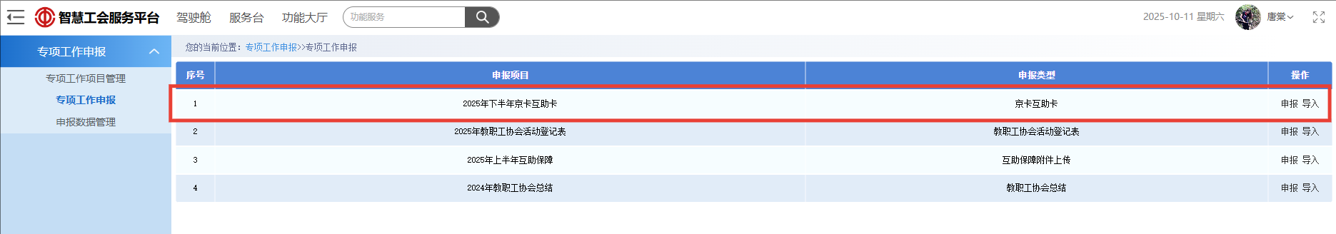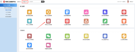 第一步:进入智慧工会服务平台,选择“功能大厅”界面,点击“专项工作申报”。